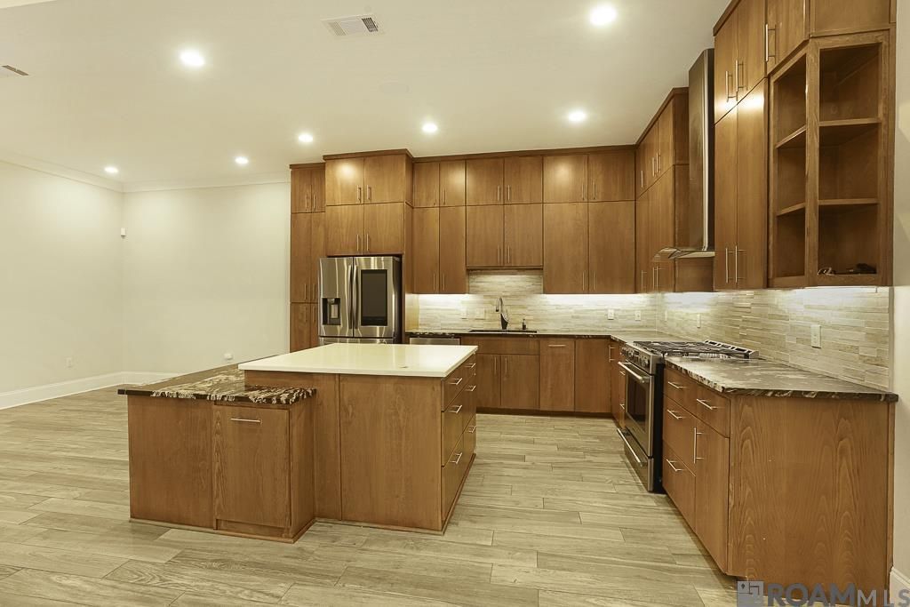 Welcome to this incredible 4-bedroom, 3-bath home in the gated community of St. Regis Place, where style, comfort, and thoughtful design come together. This stunning home features an open-concept floorplan ideal for both everyday living and entertaining. The spacious kitchen is the heart of the home with cabinets extending to the ceiling, a large center island, gas range, and abundant storage, all complemented by wood-look tile flooring throughout?no carpet. The private primary suite offers a true retreat with a spa-inspired bathroom featuring a huge double-sink vanity, soaking tub, custom tiled shower with rain head, and an oversized walk-in closet. The desirable triple-split floorplan includes two bedrooms sharing a full bath, plus a separate bedroom with its own private bath, perfect for a home office, guest room, or mother-in-law suite. Additional highlights include a garage with custom built-ins for exceptional storage and organization, a whole-home generator for peace of mind, and a fully fenced backyard. Conveniently located at the corner of Airline Highway and Old Hammond Highway, this home offers easy access to shopping, dining, and major commuter routes?all within a secure, gated neighborhood.