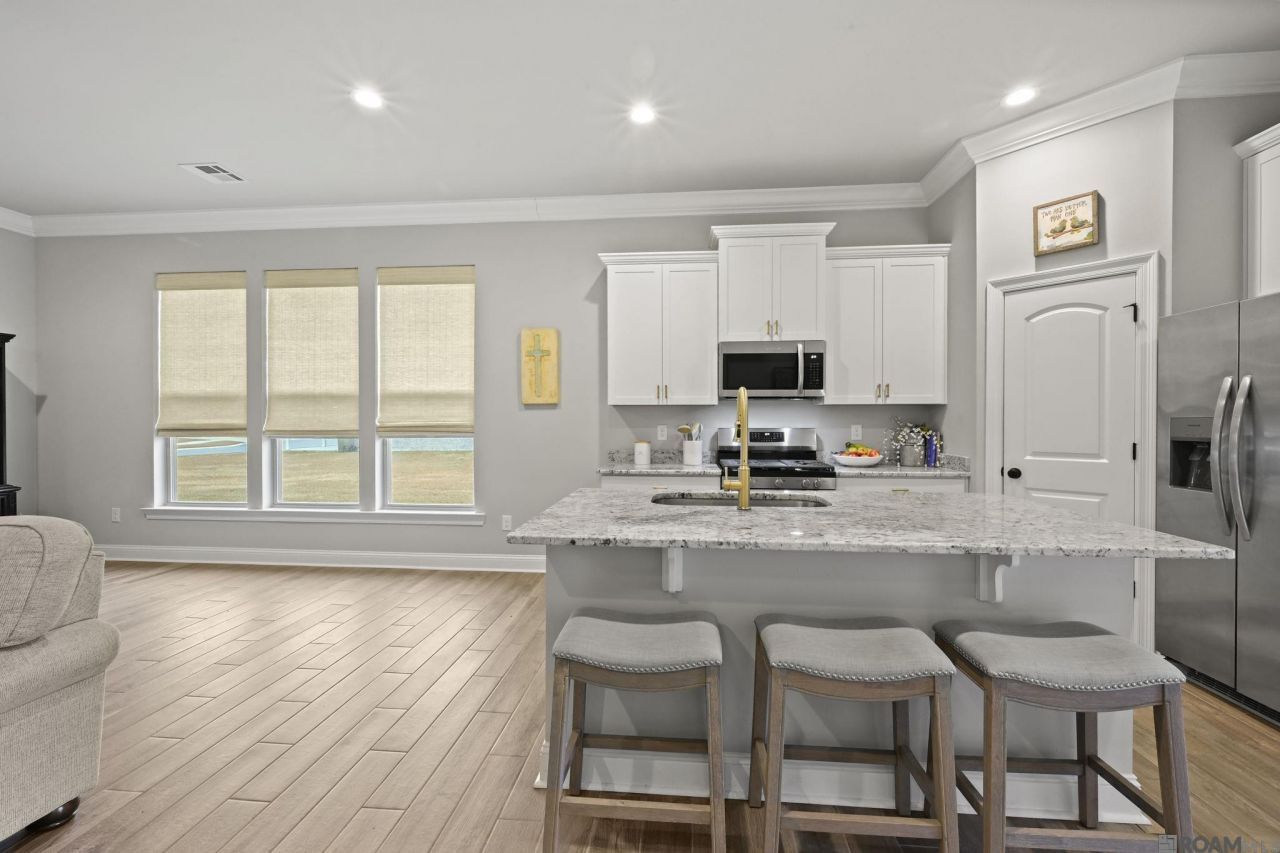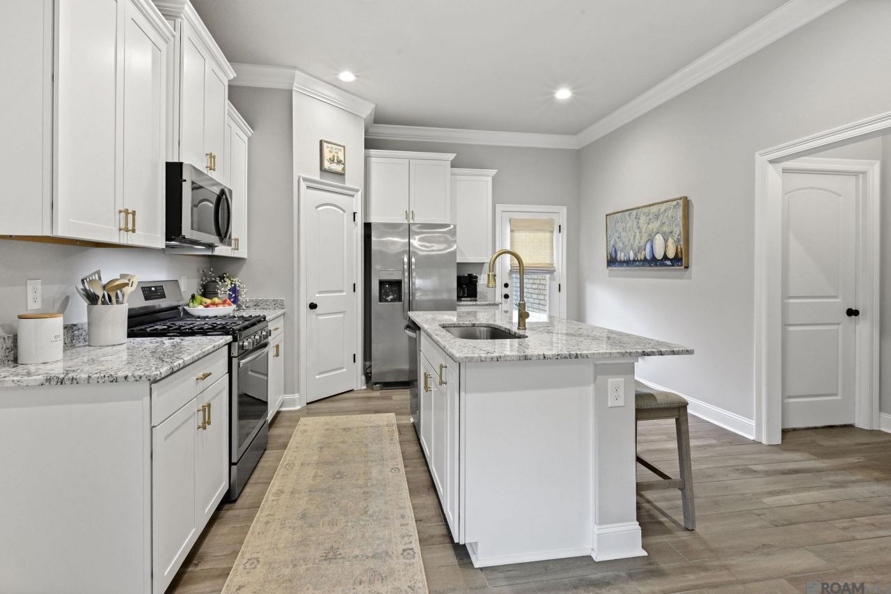 Better than NEW and ON the LAKE!! Wonderfully designed 3 Bedroom 2 Bath plus OFFICE in sought after Windsor Park in Prairieville! Open Kitchen features SLAB GRANITE countertops & island, stainless appliances including GAS COOKTOP and pantry. Large Den with HIGH CEILINGS and recessed lighting. Beautiful WOOD LOOK TILE PLANK floors throughout Living Room, Dining Room, Kitchen and Foyer. Nice Master Suite has SLAB GRANITE on dual sinks, soaking tub, separate shower and WALK-IN CLOSET. Already has WINDOW TREATMENTS and FENCE!! 2 car garage. Welcoming Front Entry, Rear Porch and fenced backyard overlooking LAKE makes for great outdoor space!!