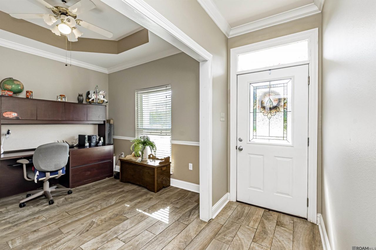 Discover comfort, space, and thoughtful upgrades in this 3-bedroom, 2.5-bath Denham Springs home offering approximately 2,000 sq. ft. of living area on a 1.6-acre cul-de-sac lot with a gorgeous, private backyard perfect for relaxing or entertaining. The open layout features bright living spaces enhanced by recessed lighting, ceramic tile flooring, and crown molding. The living room is the perfect gathering space with a fireplace, mantle, and built-in shelving. The kitchen offers granite countertops, stainless steel appliances, and custom cabinetry, and is conveniently located near a half bath for added functionality. A dedicated office?formerly a 4th bedroom?features a tray ceiling and can easily be converted back to a bedroom to fit your needs. The private primary bedroom also showcases a tray ceiling, and the en suite includes a granite-top vanity, garden tub, large walk-in shower with a built-in seat, and a generous walk-in closet. A versatile man/she cave (not included in the heated/cooled square footage) provides flexible space for a studio, gym, or hobby room. Outside, enjoy a beautifully landscaped yard, storage shed, covered carport, and a covered RV port, along with an extended driveway offering additional parking. Located in a quiet, established neighborhood near great schools, shopping, and dining, this property offers the tranquility of acreage with everyday convenience. Schedule your showing today!