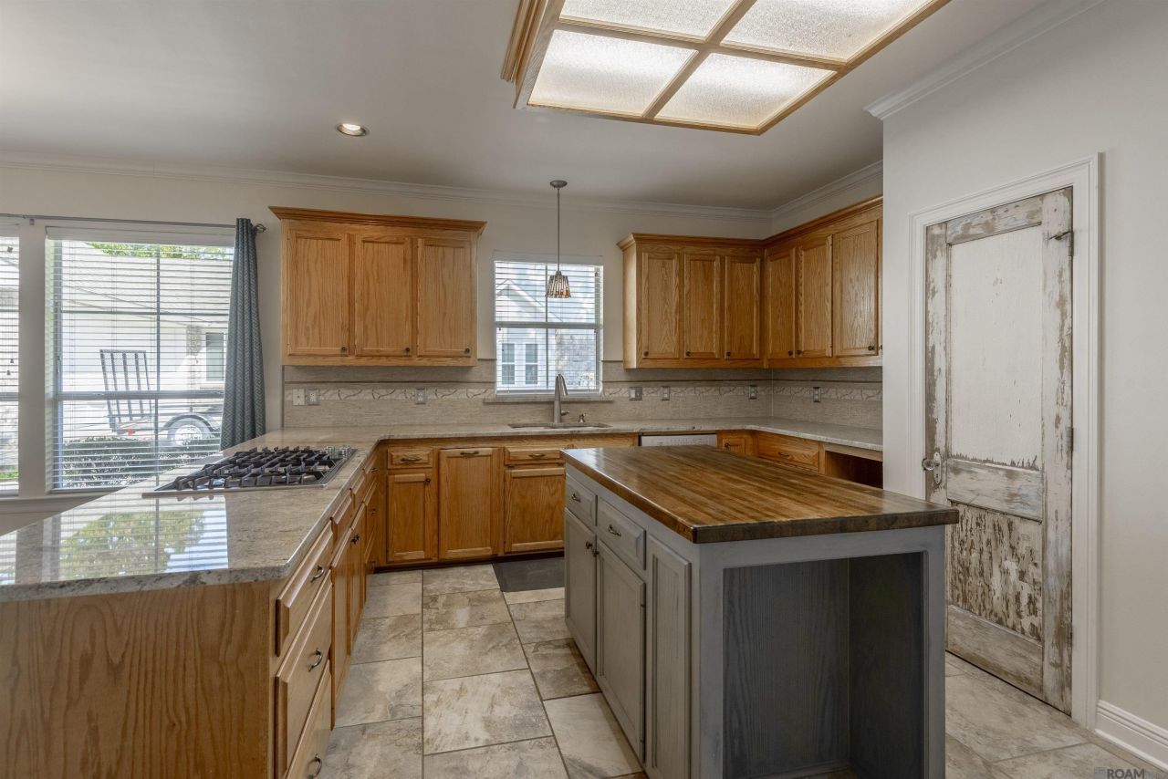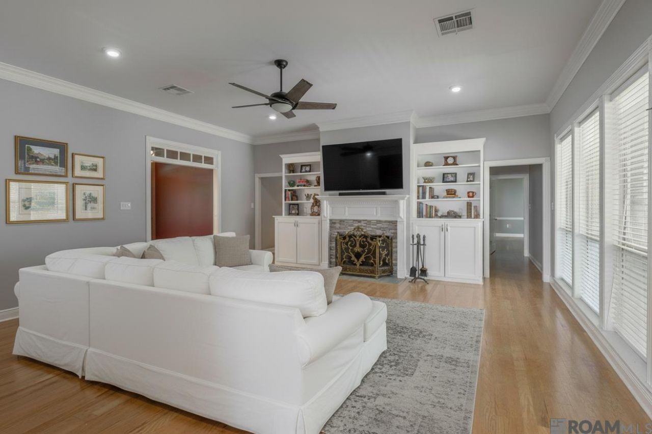 Welcome home to this lovingly maintained ONE story 5 bed 3 bath with office conveniently located in Afton Oaks Subdivision. Acadian style front porch invites you to enter and see gleaming hardwood that runs in foyer, dining, main living area & primary. Imagine the family gatherings in this dining room filled with natural light from the large picture window with family & friends around the table. Living room features gas log fireplace with wood mantel, custom built-ins, crown molding, 10ft ceilings, small wet bar area & bank of windows that allow the sunlight to flow into the space. This kitchen you can spread out & cook. Plenty of usable counter space with slab granite, custom cabinets, & walk in pantry with antique door. Appliances include: double wall oven, Bosch dishwasher & gas cooktop with down draft vent. Appreciate the multiple living spaces available. Extra room can serve as dedicated office/study with custom built-ins function as an awesome kids game room or media room. Spacious primary suite with wood flooring, trayed ceiling, & ceiling fan serves as a relaxing retreat with private en-suite bathroom includes dual vanity, framed mirror, granite counter, custom job built tile walk-in shower, water closet, plus wrap around walk-in closet. This triple split floorplan offers Mother in law wing withnew carpet & full bath with walk in tiled shower off the kitchen area. Plus 3 additional bedrooms all newly carpeted with shared full bath. Other amenities include: Roof Dec 2022, BRAND NEW carpet, mature landscaping, rear carport, additional concrete parking, security system, & outside storage room. Flood Zone X. Home has never flooded. Make your appointment today for private showing.