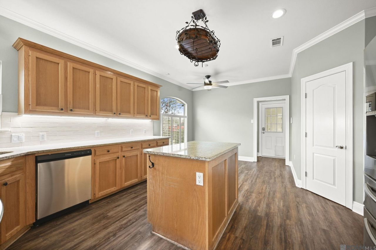 Immaculate 3-bedroom, 2.5-bath home with a formal dining room in the established Quail Creek subdivision near the new Prairieville High School. Fresh interior and exterior paint and a roof only one year old make this home truly move-in ready. The spacious kitchen features an island, granite countertops, a beautiful white tile backsplash, tons of cabinet space and under- and over-cabinet lighting. The living room offers a gas fireplace, built-ins, and large windows overlooking the fully fenced backyard. Step outside to a massive backyard with a covered patio perfect for entertaining. The primary suite includes an en-suite bath with his-and-her vanities and a large garden tub, separate shower and a wrap around closet. Additional highlights include oversized attic storage, two exterior storage rooms, and a two-car garage. This home is in flood zone x and does not require flood insurance. Some photos are virtually furniture staged.