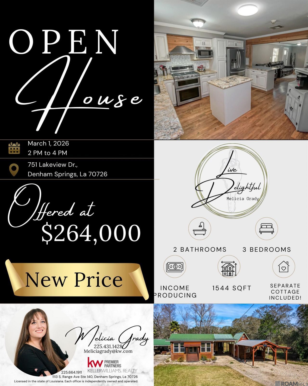 One address, TWO HOMES with built-in income in the heart of where Denham Springs comes alive?welcome to life on Lakeview Drive. This charming and versatile cottage is perfectly positioned and centrally located offering effortless access to Antique Village, Bass Pro Shops, Juban Road shopping and dining, local restaurants, and quick connectivity to I-12?making daily living both convenient and enjoyable. Inside, you'll find an inviting open-concept layout across this thoughtfully designed living space. The kitchen is the heart of the home, showcasing a granite island and countertops, decorative backsplash, breakfast bar, gas range/oven, and elegant crown molding. It flows seamlessly into the living and dining areas, where wood flooring and crown molding create a warm, cohesive space ideal for entertaining or relaxing. The bedroom layouts offer both privacy and comfort, with wood flooring throughout. The third bedroom is notably spacious and tucked away for added privacy. Adding exceptional value is the detached approximately 355 sq ft guest house, complete with a living area, kitchenette, bedroom, full bath, and loft. This space can remain furnished and is currently income-producing, as the seller rents it via Airbnb for approximately $1,600 per month?perfect for guests, extended family, or supplemental income. This property offers charm, flexibility, and location all in one. Schedule your private showing today and discover the possibilities waiting for you at 751 Lakeview Drive!