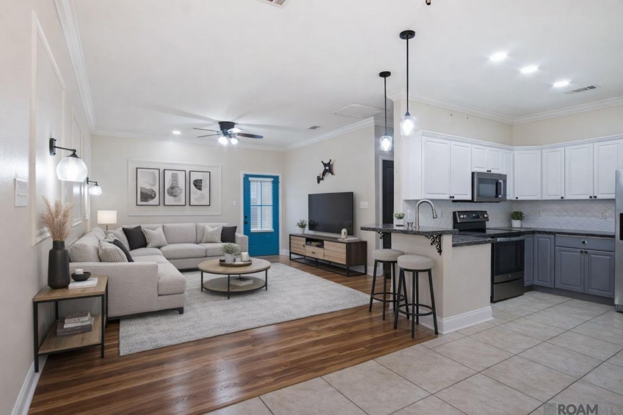 Welcome to this beautifully maintained 2-bedroom, 2-bath corner-unit condominium in the highly desirable Juban Courts community of Denham Springs. Offering 1,157 square feet of living space and peaceful water views, this end unit combines comfort, privacy, and an unbeatable location. Inside, you'll find an inviting open layout featuring wood laminate flooring throughout and ceramic tile in wet areas. The kitchen is well-appointed with stained cabinetry, granite countertops, nice appliances, and a walk-in pantry, making it both functional and stylish. Both bedrooms are generously sized, with the primary suite overlooking the water, creating a serene retreat. The primary bath has double vanities and two walk-in closets. Step outside and enjoy resort-style amenities including a stocked pond with fountains, splash pad, playground, dog park, and a charming bridge over the lake. The community also offers gated access for added peace of mind. This unit includes a 2-car garage, a private fenced patio area, and is ideally situated just off Juban Road with quick access to I-12, shopping, dining, and entertainment. Whether you're looking for a low-maintenance home or a smart investment opportunity, this property checks all the boxes. Don't miss the opportunity to own a waterfront condo in one of Denham Springs' most convenient and sought-after locations! Photos are edited by a professional photo editor for marketing purposes. Some photos may have Ai Generated Furniture in the homes for visualization purposes.